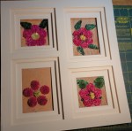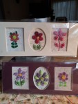 Making the moosetufting flowers were fun needed a new slant so decided to put porcupine quills as the centre of the moosetufting picture but in tufting form. The quills had to be damp so it could stitch it tight then sprayed out then cut. This was done with the nest batch of flower picture as and was a hit with people saying it was different.